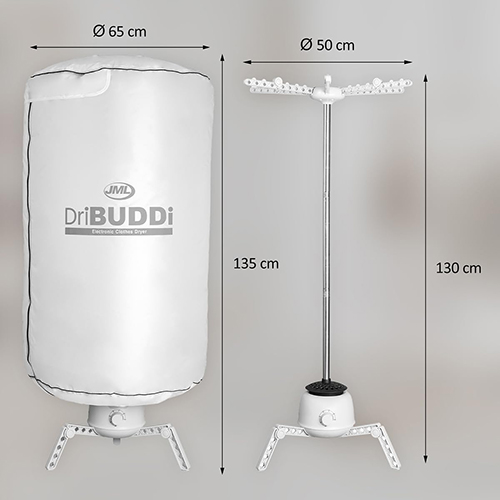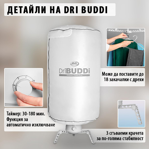 DriBUDDi е електрическа сушилня за дрехи за вътрешна употреба, която побира до 10 кг влажни дрехи, приблизително стандартно количество за 1 пране. Сушенето става благодарение технологията за циркулация на топъл въздух, генериран от мощен нагревателен елемент с мощност 850 W, и циркулира в специално проектиран текстилен калъф. Този калъф позволява на въздуха да суши дрехите нежно, но ефективно, с резултата на свежо проветриво пране на открито, но много по-бързо и на минимална част от цената на сушилня.