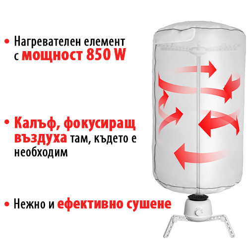 Топлият въздух от нагревателния елемент с мощност 850 W циркулира през и около дрехите ви чрез калъфа, който фокусира въздуха там, където е необходим за нежно, но ефективно сушене. Той също така държи мокрите ви дрехи на едно място, защитени от козина от домашни любимци, мъхове, прах и мръсотия. Сушенето с електрическа сушилня за дрехи с калъф значително намалява гънките, няма да доведе до свиване и оставя дрехите ви да се чувстват сухи като на въже и свежи.