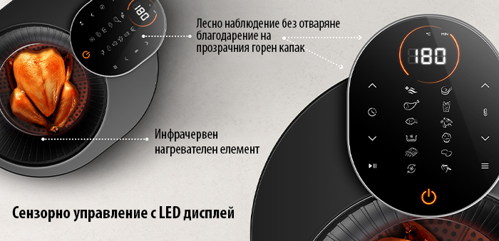 Освен циркулацията на горещ въздух, SkyFry разполага с инфрачервен нагревателен елемент, който подпомага по-равномерното изпичане. Резултатът е именно това, което търсите: картофките стават приятно хрупкави, а месото – по-сочно и крехко.