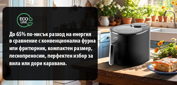 Уредът може да се използва като компактна „фурна“ с горещ въздух и според описанието консумира до 65% по-малко енергия в сравнение с обикновена фурна. Освен това е удобен за пренасяне – подходящ за вила, каравана или къмпинг, когато искате домашно вкусно готвене и извън града.