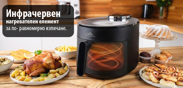 Насладете се на любимите си „пържени“ ястия без угризения! Фритюрникът с горещ въздух ETA SkyFry използва циркулация на горещ въздух, за да приготвя храната равномерно от всички страни, а благодарение на прозрачния капак можете да следите процеса без да отваряте уреда и без да губите ценна топлина. С голямата 5-литрова кошница с решетка ще приготвите златисти картофки, крилца, стекове, зеленчуци, фалафел и още много – а бонусът е, че SkyFry се справя отлично и със сладкиши, мъфини и тестени изделия. Един истински мултифункционален помощник за модерната кухня.