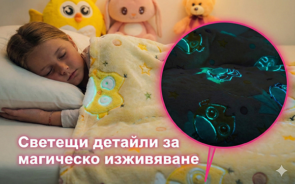 Одеялото не само топли, но и омагьосва със светещи елементи, които превръщат всяка вечер в приказка.