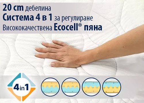 Матракът с дебелина 20 см разполага с уникална система 4 в 1 за персонализирана твърдост (мека или твърда страна). Изработен от висококачествена Ecocell® пяна и мемори пяна, той осигурява отличен комфорт и се адаптира перфектно към извивките на гръбначния стълб за здравословен сън.
