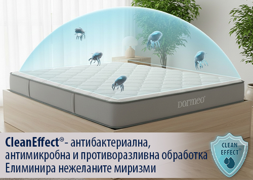 Матракът е обработен с CleanEffect® - антибактериална, антимикробна и противоразливна обработка. Тя създава защитна бариера срещу алергените, осигурявайки облекчение за хората с алергии и чувствителна кожа. Елиминира нежеланите миризми, като запазва матрака ви свеж и чист. Кажете сбогом на неприятните миризми и се насладете на освежаващ сън!