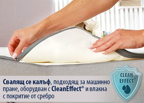 Калъфът се сваля и може да се пере, оборудван с CleanEffect® и влакна с покритие от сребро, което предотвратява навлизането на прах и осигурява защита срещу бактерии, акари и неприятни миризми.