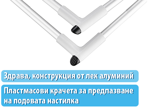 Изработен е от лек алуминий и издръжлива пластмаса, което съчетава стабилност и удобство при местене. Пластмасовите крачета допълнително предпазват подовата настилка от надраскване- полезно за ламинат, паркет и плочки.