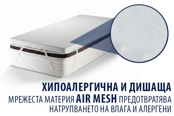 - Хипоалергичен протектор с Air Mesh технология: Включеният протектор е изработен от хипоалергична и дишаща мрежеста материя Air Mesh, която не само предпазва матрака, но и допринася за подобрена циркулация на въздуха, като така се предотвратява натрупването на влага и алергени.