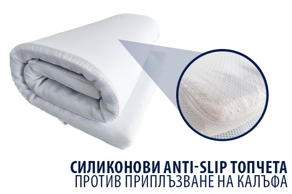 - Anti-Slip силиконови топчета: Протекторът е оборудван със силиконови Anti-Slip топчета, които предотвратяват всякакво приплъзване на калъфа, осигурявайки стабилност и непрекъснат комфорт по време на сън.