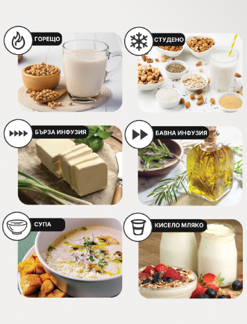 - Множество функции в един уред – ядково и соево мляко, смутита, супи, масла, кисело мляко.